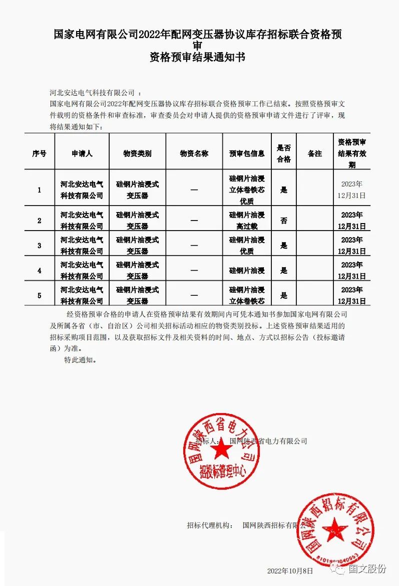 根据国家电网有限公司2022年配网变压器协议库存招标联合资格预审资格预审结果通知书,按照资格预审文件载明的资格条件和审查标准,审查委员会对申请人提供的资格预审申请文件进行了评审:意昂体育 科技有限公司硅钢片油浸式变压器通过国家电网有限公司2022年配网变压器协议库存招标联合资格预审,可在资格预审结果有效期间内可凭本通知书参加国家电网有限公司及所属各省(市、自治区)公司相关招标活动相应的物资类别投标。