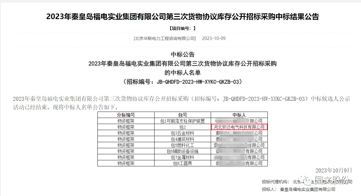 10月9日,2023年秦皇岛福电实业集团有限公司第三次货物协议库存公开招标采购(招标编号:JB-QHDFD-2023-HW-XYKC-GKZB-03)中标候选人公示活动已经结束。中标人名单在公告中公布。意昂体育 科技有限公司成功中标物资框架包2。