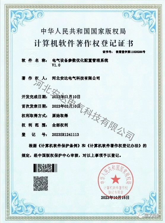11月1日,安达电气收到国家版权局下发的电气设备参数优化配置管理系统V1.0的软著证书(证书号:软著登字第11828236号)。