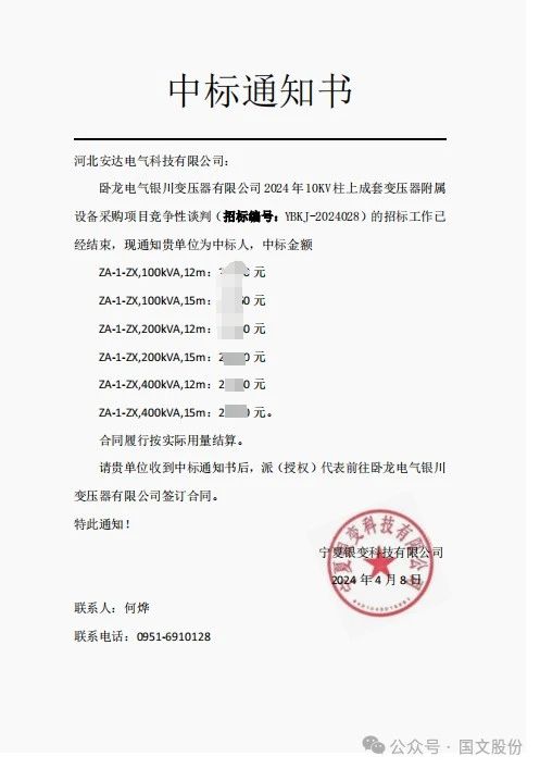 4月8日,安达电气收到宁夏银变科技有限公司发出的中标通知书。 安达电气成功通过了卧龙电气银川变压器有限公司2024年10KV柱上成套变压器附属设备采购项目竞争性谈判(招标编号:YBKJ-2024028)招标,成为中标人。