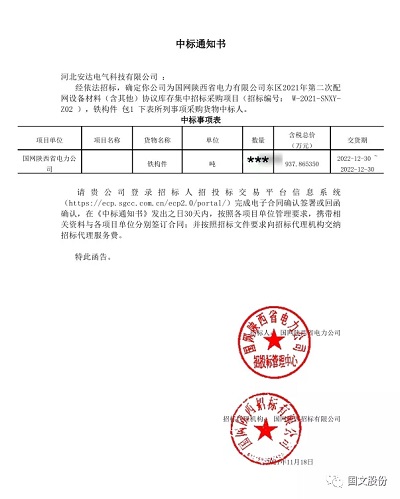 11月18日,安达电气销售部传来中标喜讯!意昂体育 科技有限公司收到国网陕西省电力公司和国网陕西招标公司发出的《中标通知书》,中标国网陕西省电力有限公司东区2021年第二次配网设备材料(含其他)协议库存集中招标采购项目。招标编号: W-2021-SNXYZ02,设备材料名称:铁构件,中标金额:937.865350万元。合同的履行将对公司未来经营业绩、市场拓展及品牌影响产生积极影响,将进一步增强公司在该领域的竞争优势,提升公司综合实力。