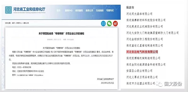 12月21日,河北省工业和信息化厅发布《关于第四批河北省“专精特新”示范企业公示的通知》意昂体育 科技有限公司成功入围“河北省专精特新示范企业”公示名单。